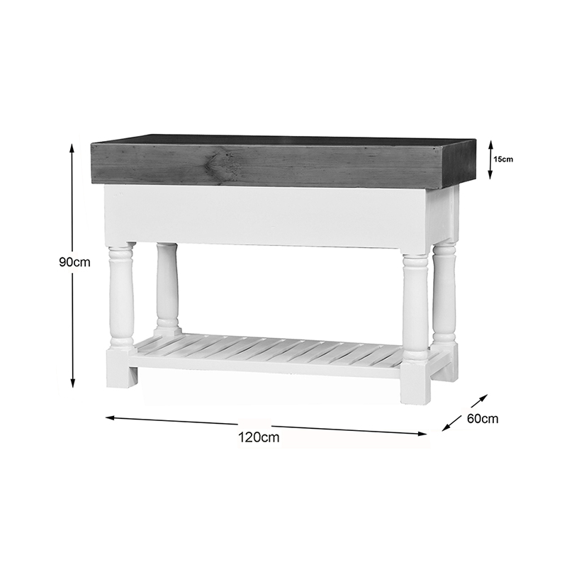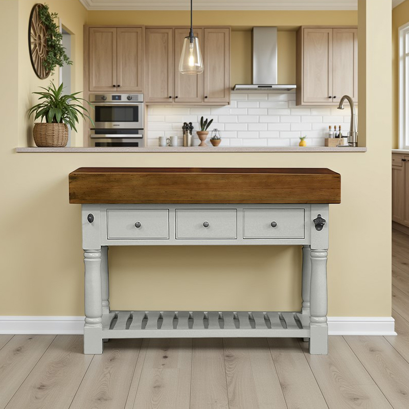 - This butchers block combines solid hardwood top in French oak colour and Retro Grey painted frame for a contemporary take on the classic country farmhouse look.