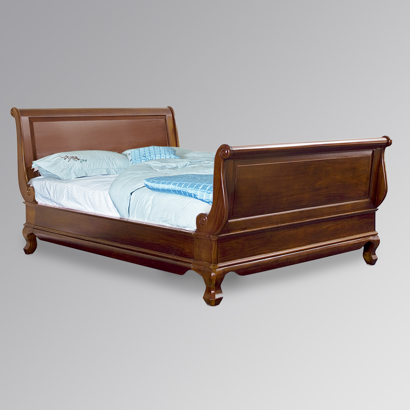 This stunning Chantilly Sleigh bed is made from solid mahogany wood , hand polished and finished to a beautiful satin patina in Chestnut  colour. This is our in house design  inspired by the Louis XVI era of French furniture circa 1775. This style has high end footboards and with those scrolled ends, this Lit Bateau bed will compliment a variety of bedroom settings.