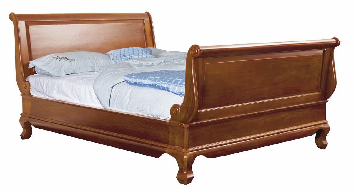 This stunning Chantilly Sleigh bed is made from solid mahogany wood , hand polished and finished to a beautiful satin patina in Nutmeg colour. This is our in house design inspired by the Louis XVI era of French furniture circa 1775. This style has high end footboards and with those scrolled ends, this Lit Bateau bed will compliment a variety of bedroom settings.