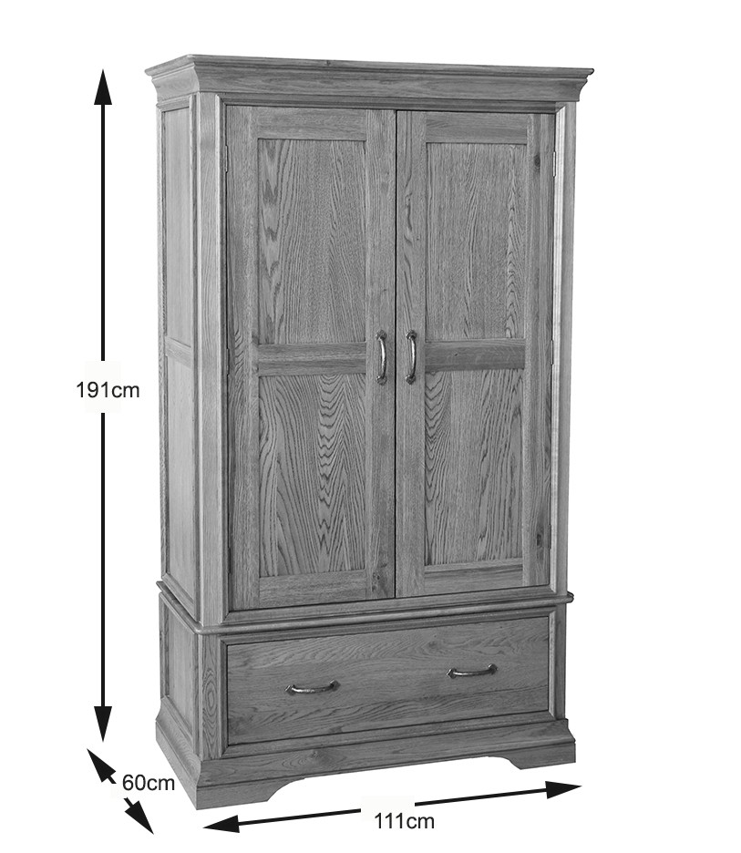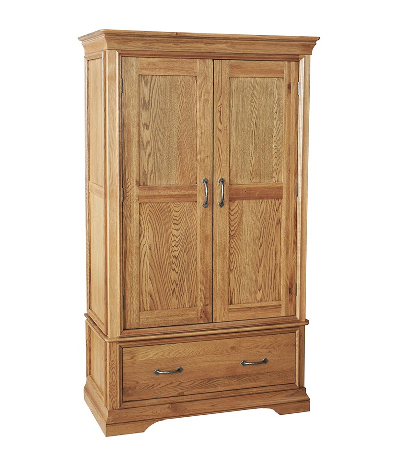 Bring the opulence of French furniture into your bedroom with this beautiful Montagne Gents Wardobe , having a single large drawer and lots of hanging space. This beautifully designed piece from Island Furniture has been hand carved from solid oak wood and takes design inspiration from the Louis Philippe era of French furniture circa 1845. It is finished in a soft sheen lacquer which brings out the grain beautifully and is hand polished to give extra lustre.