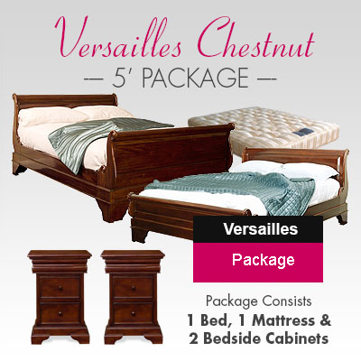 This beautiful Versailles sleigh bed is made from solid mahogany wood , hand polished and finished to a beautiful satin patina in Chestnut color. The design is from the Louis Philippe era of French furniture circa 1845. With scrolled ends and high end curved footboards, this Lit Bateau sleigh bed radiates a feeling of opulence and French glamour that will compliment a variety of bedroom settings.
