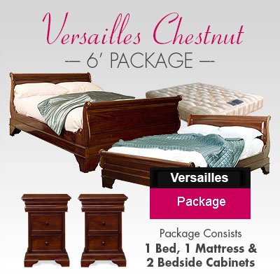 This beautiful Versailles sleigh bed is made from solid mahogany wood , hand polished and finished to a beautiful satin patina in Chestnut color. The design is from the Louis Philippe era of French furniture circa 1845. With scrolled ends and high end curved footboards, this Lit Bateau sleigh bed radiates a feeling of opulence and French glamour that will compliment a variety of bedroom settings.