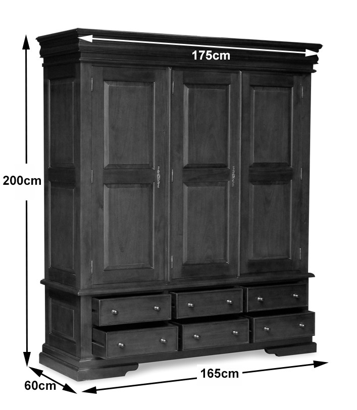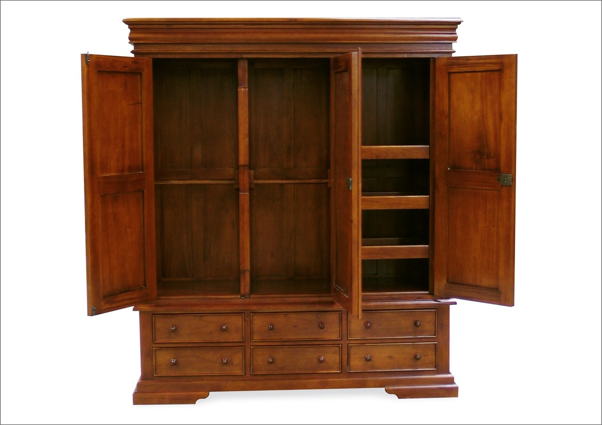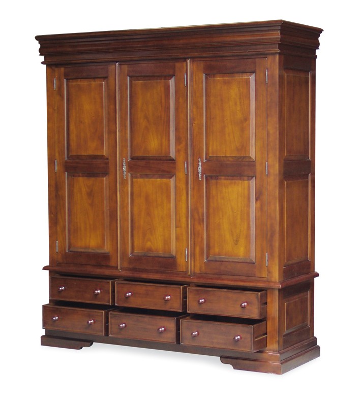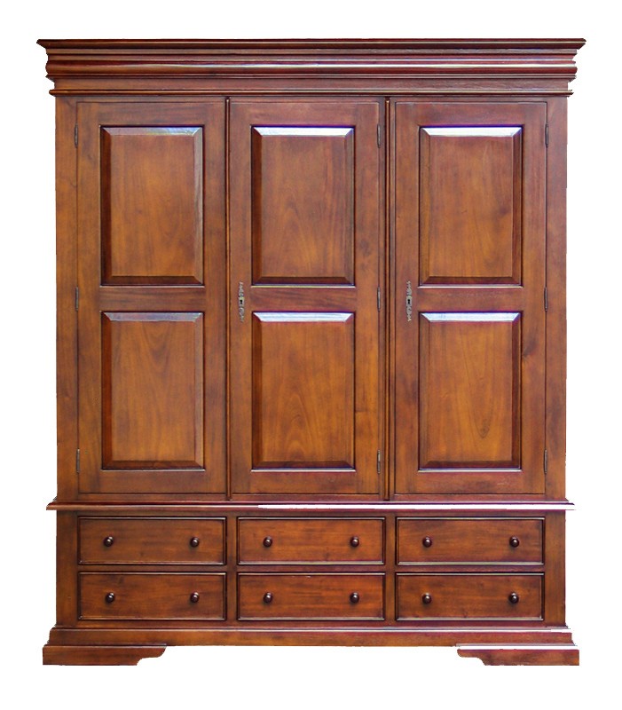 This beautiful Versailles Six Drawer Triple Robe is made from solid mahogany wood, hand polished and finished to a beautiful satin patina in Nutmeg colour. The design is from the Louis Philippe era of French furniture circa 1845. This piece is an authentic reproduction, with full hanging and underneath drawers. Sometimes called a triple gents robe, the six drawers in the base provide great storage space and it is the perfect compliment to finish off the Versailles sleigh bed collection.